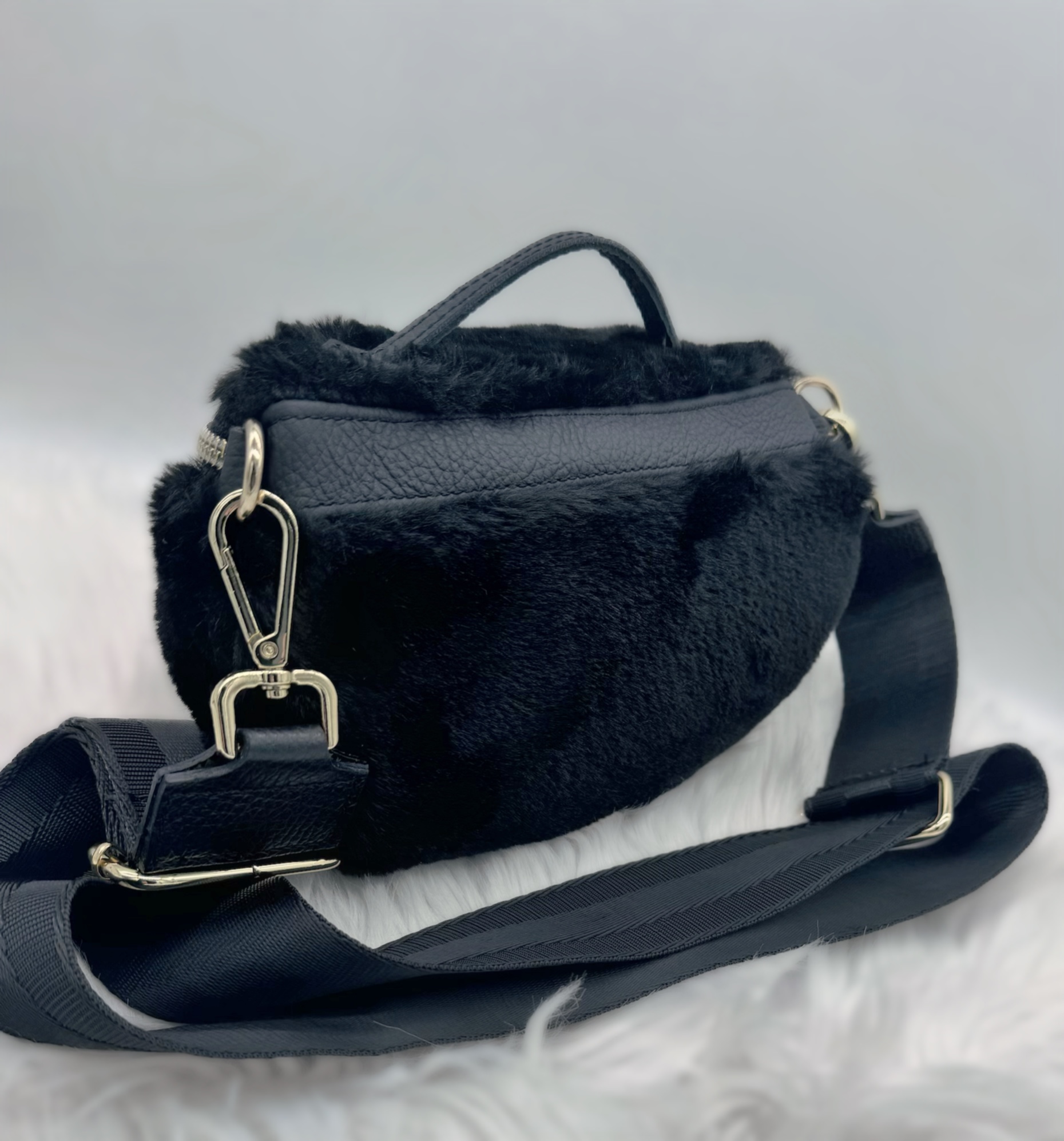 wurde aus einem Echtlederrest und aus einer Jacke aus Kunstfell gefertigt.