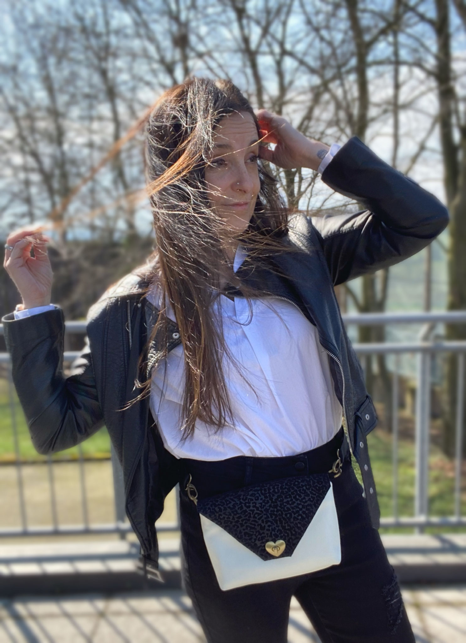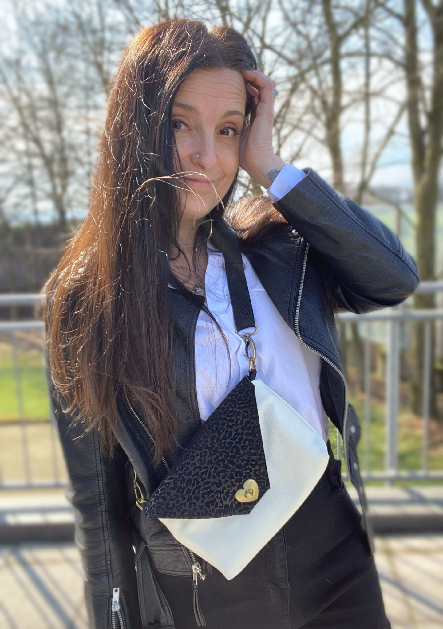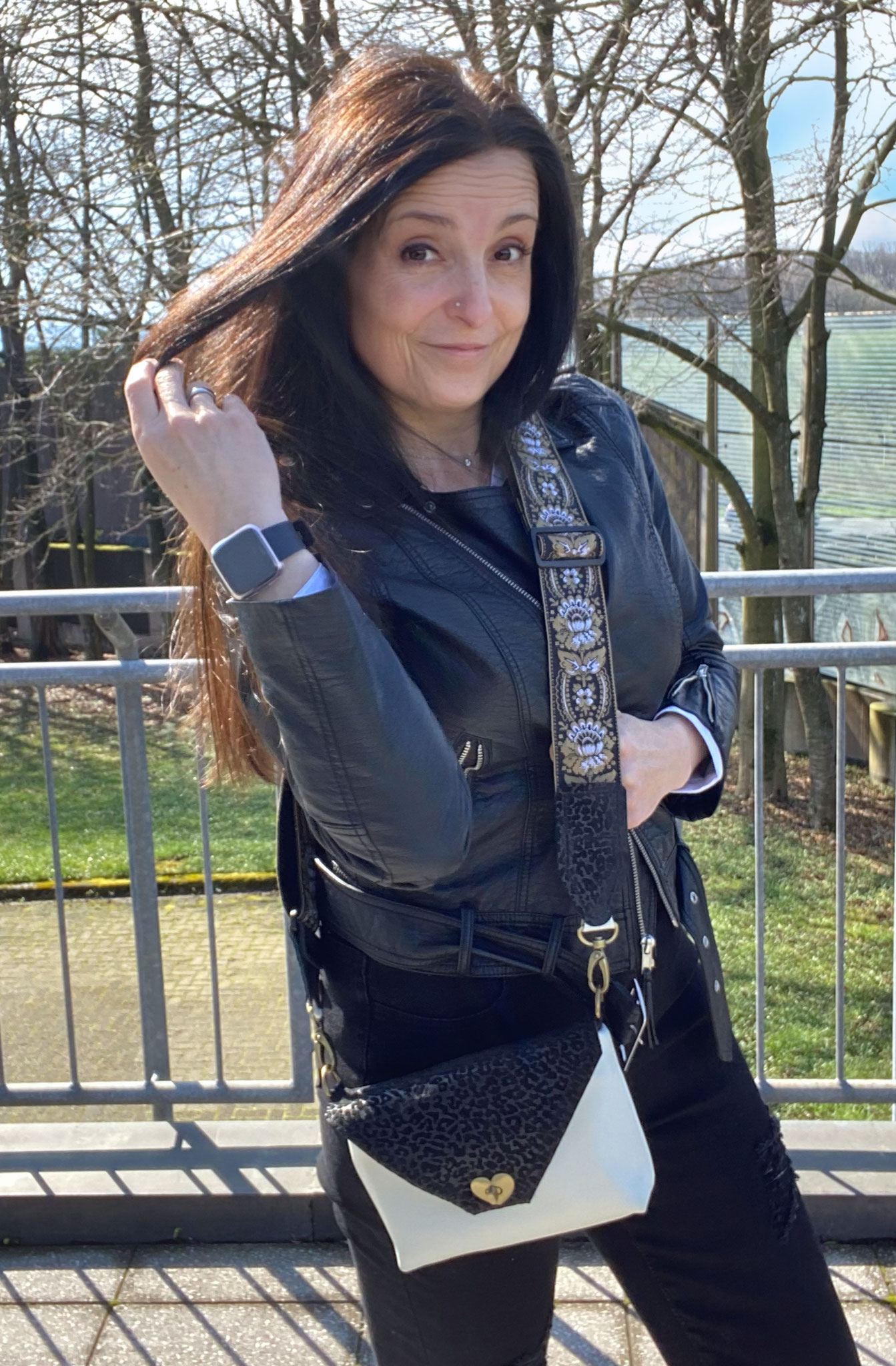 verfügt über einen zweiten Gurt (Gitarrengurt), angepasst an den Look der Tasche. Die Lederelemente wurden mit dem passenden Material aufgewertet.