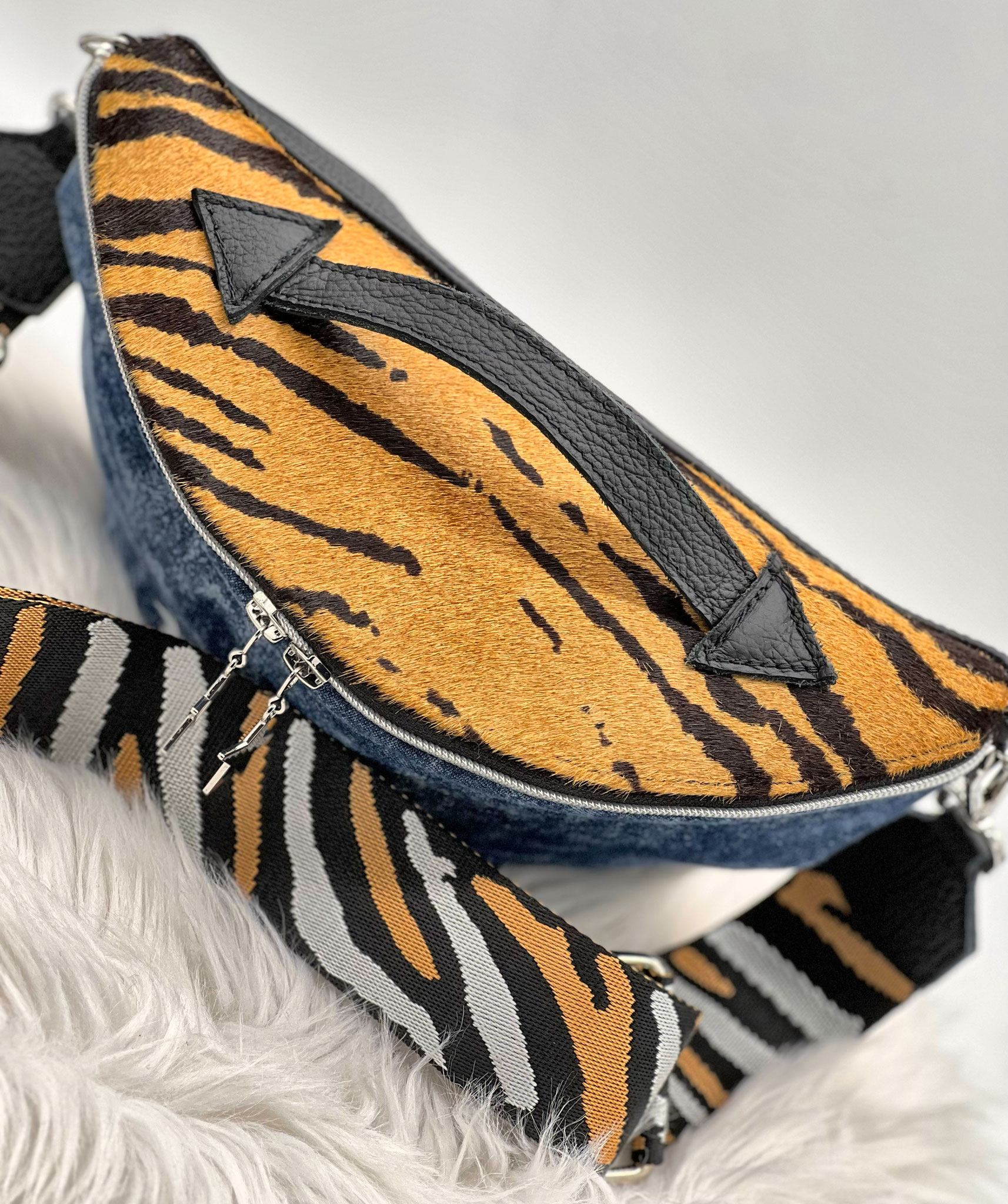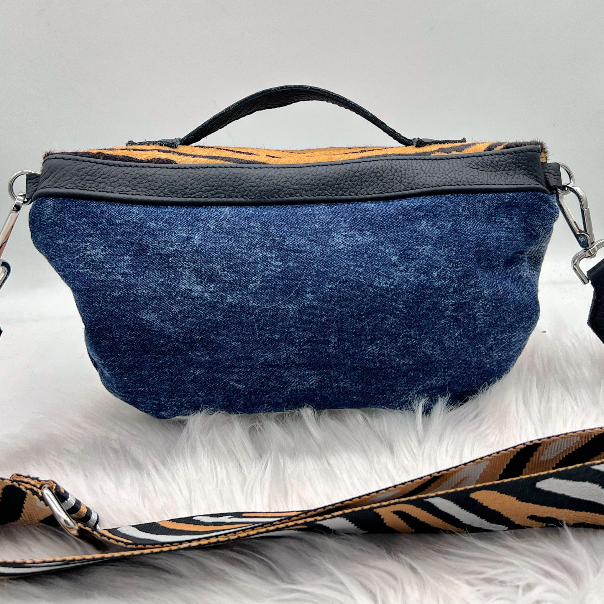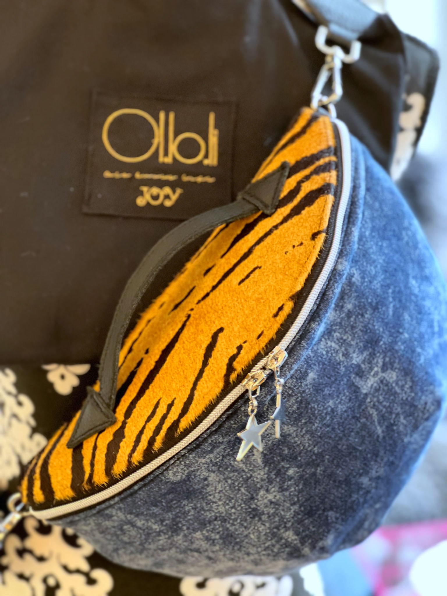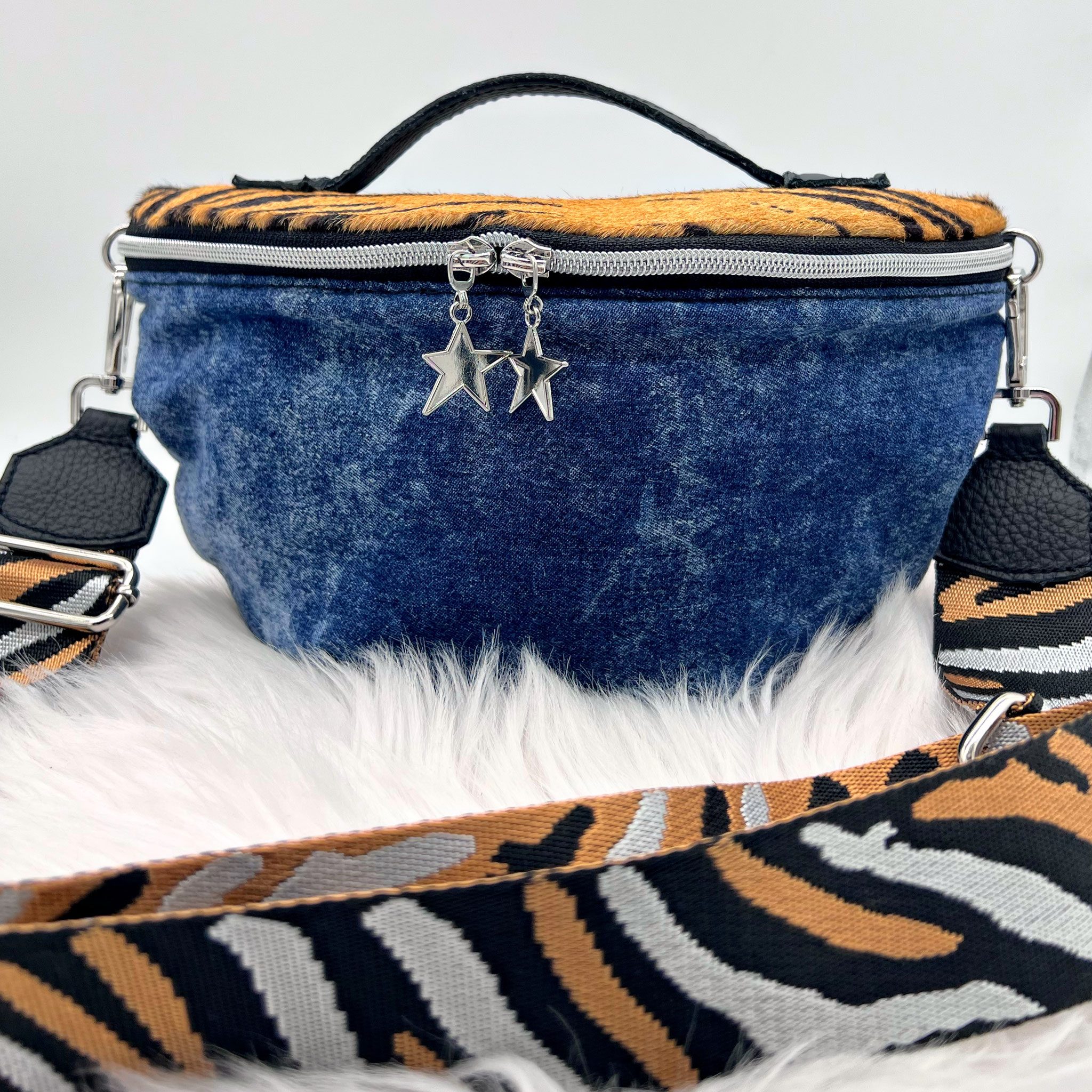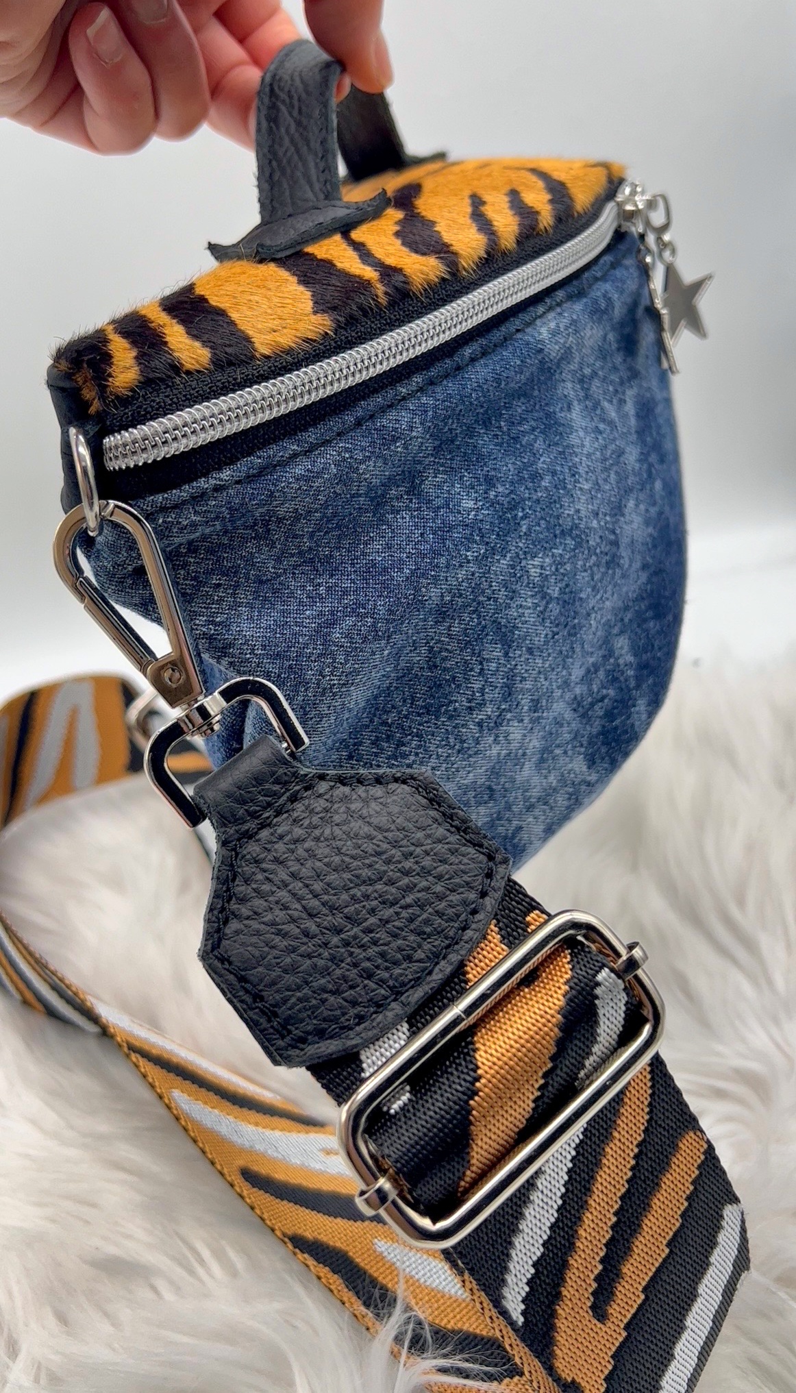 wurde aus einer Jeansjacke und einem tollen Lederrest ( Tigerprint ) gefertigt .