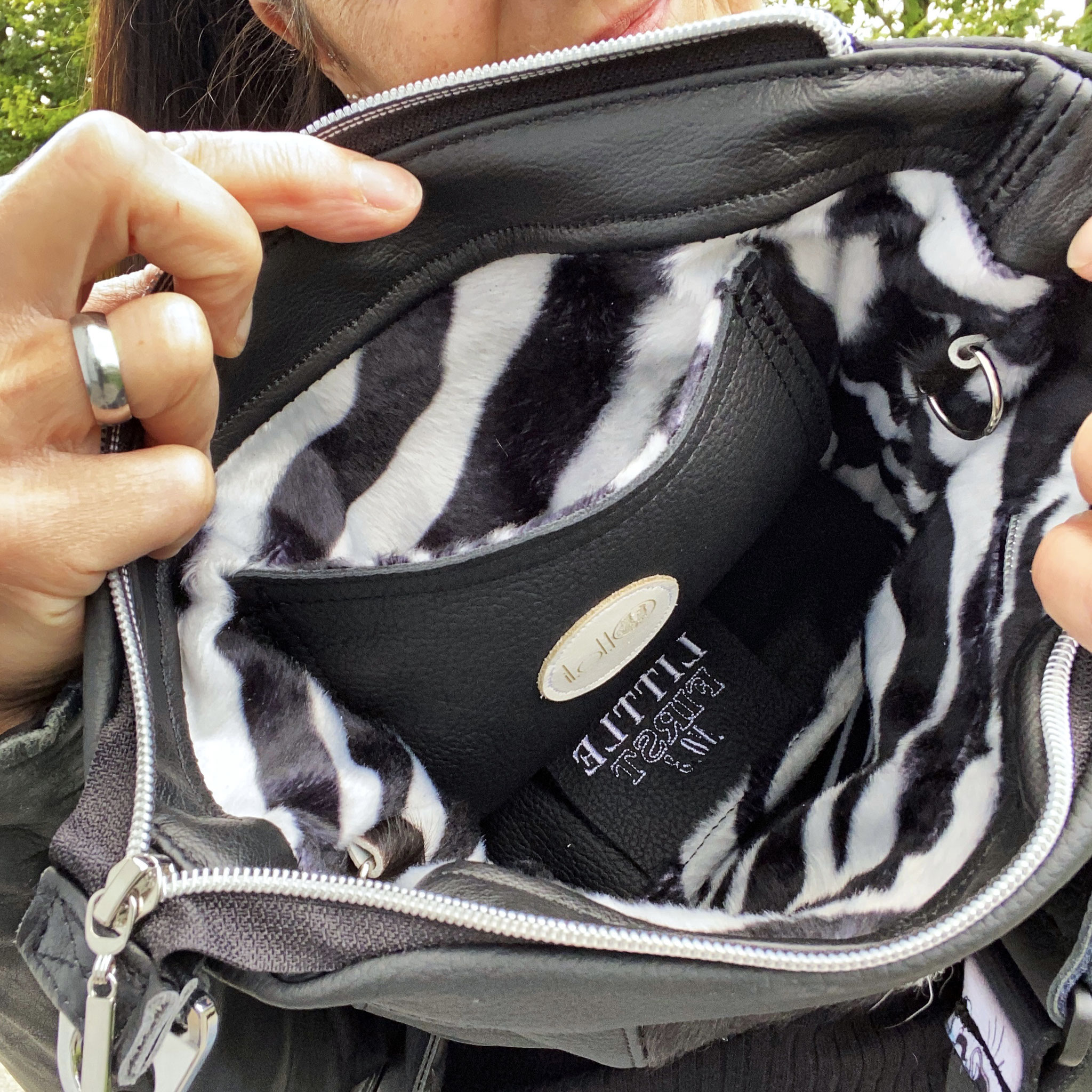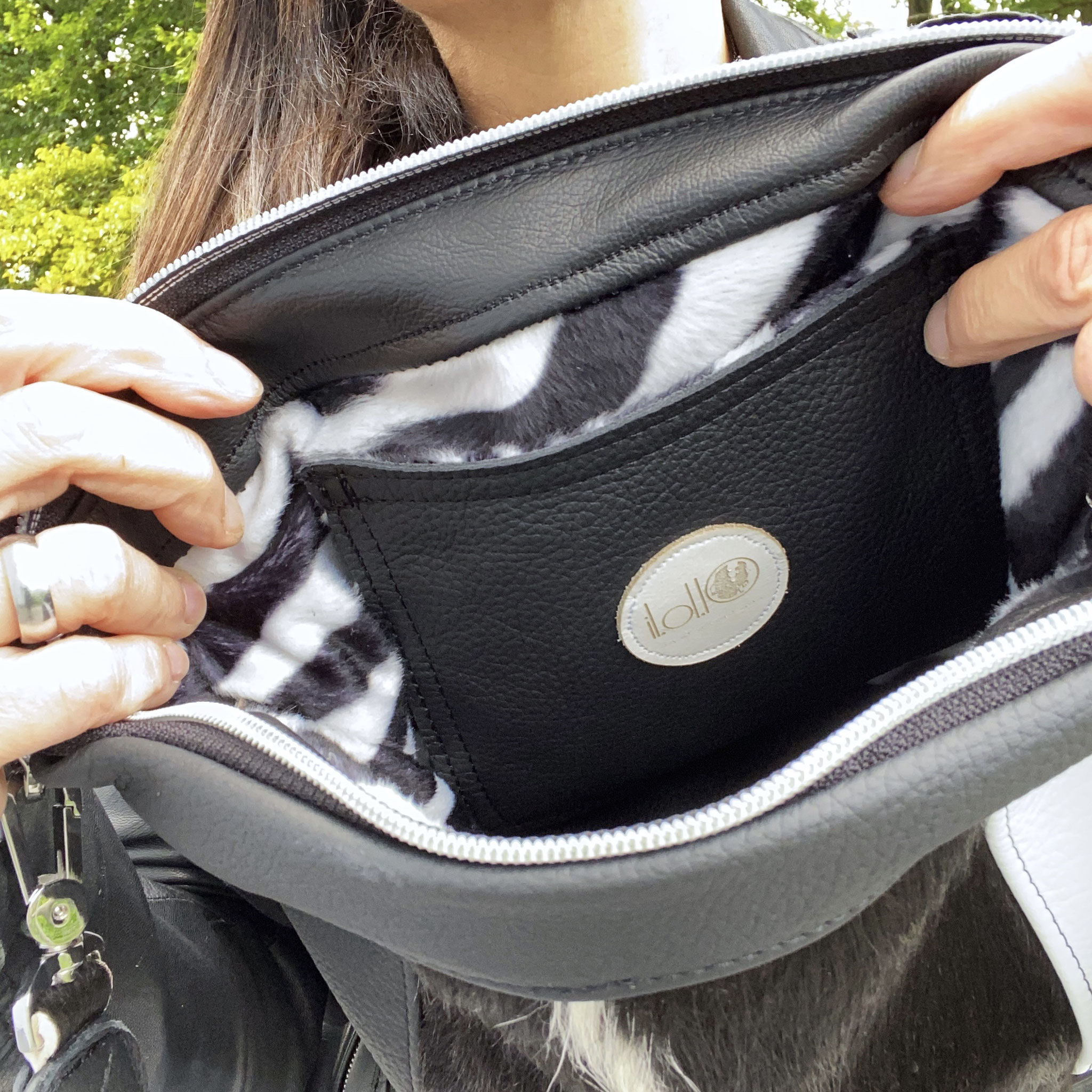 verfügt im Innenraum über ein Handy / Einsteckfach, ein Reißverschlussfach und 2 Ringe zum Anbringen eines oder mehrerer Schlüssel 🔑 mit Karabiner.