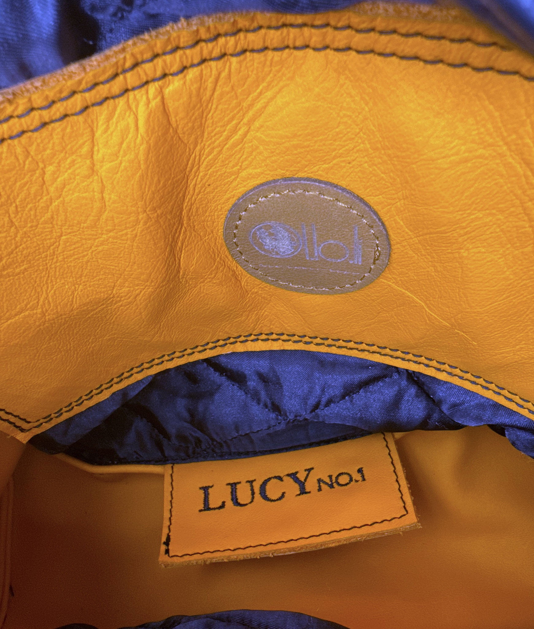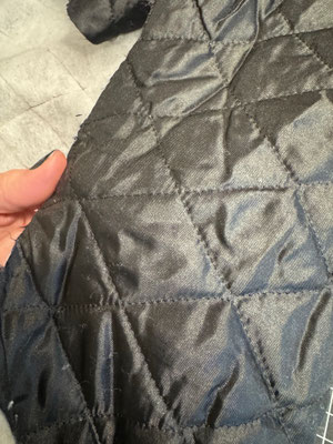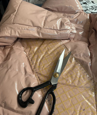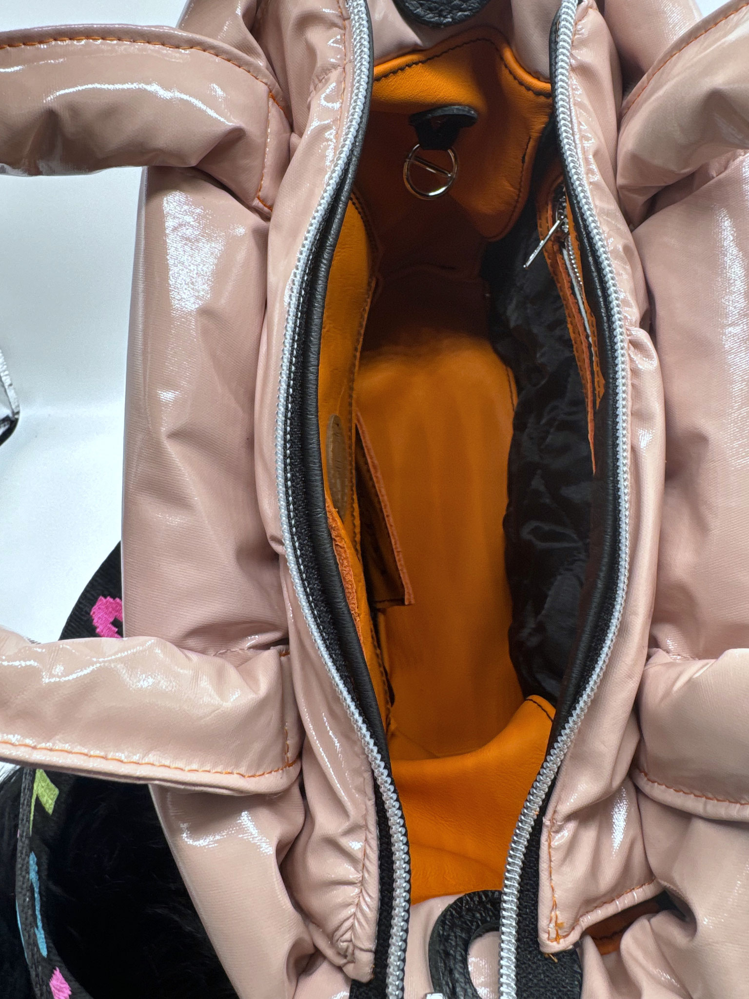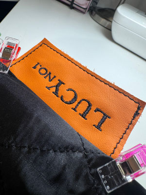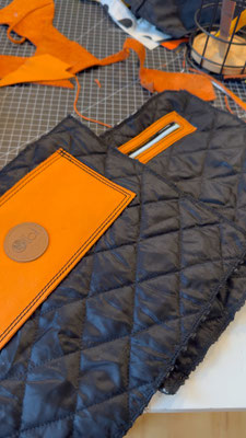 entstand aus dem Rest einer Steppjacke und dem Innenfutter einer Lederjacke und wurde mit orangefarbenen Lederstücken im Innenbereich veredelt.