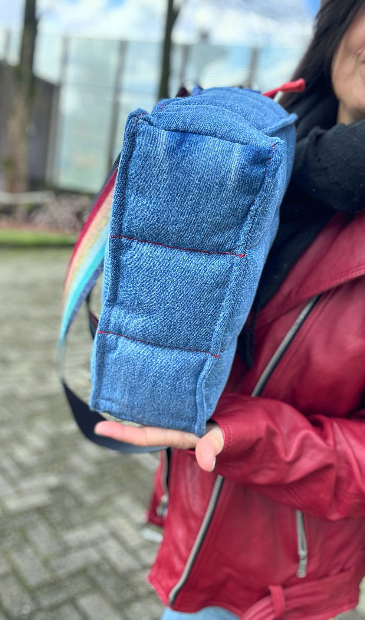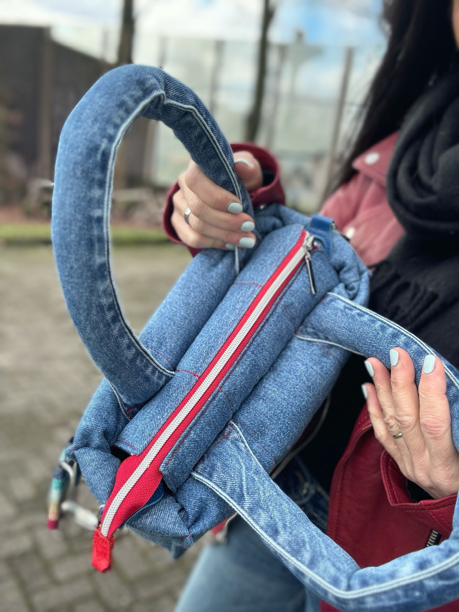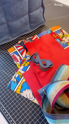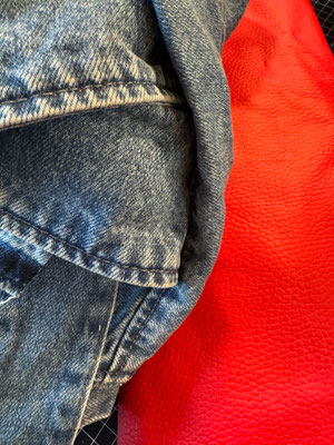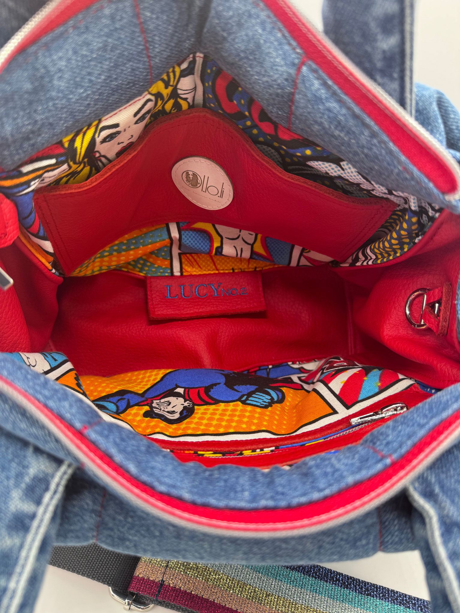entstand aus einer Jeansjacke und einem Comic Stoff und wurde mit roten Lederstücken im Innenbereich veredelt.