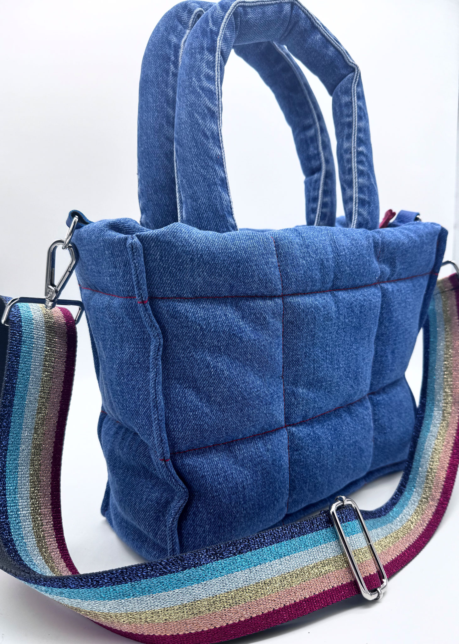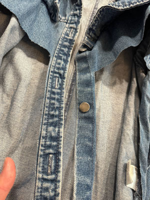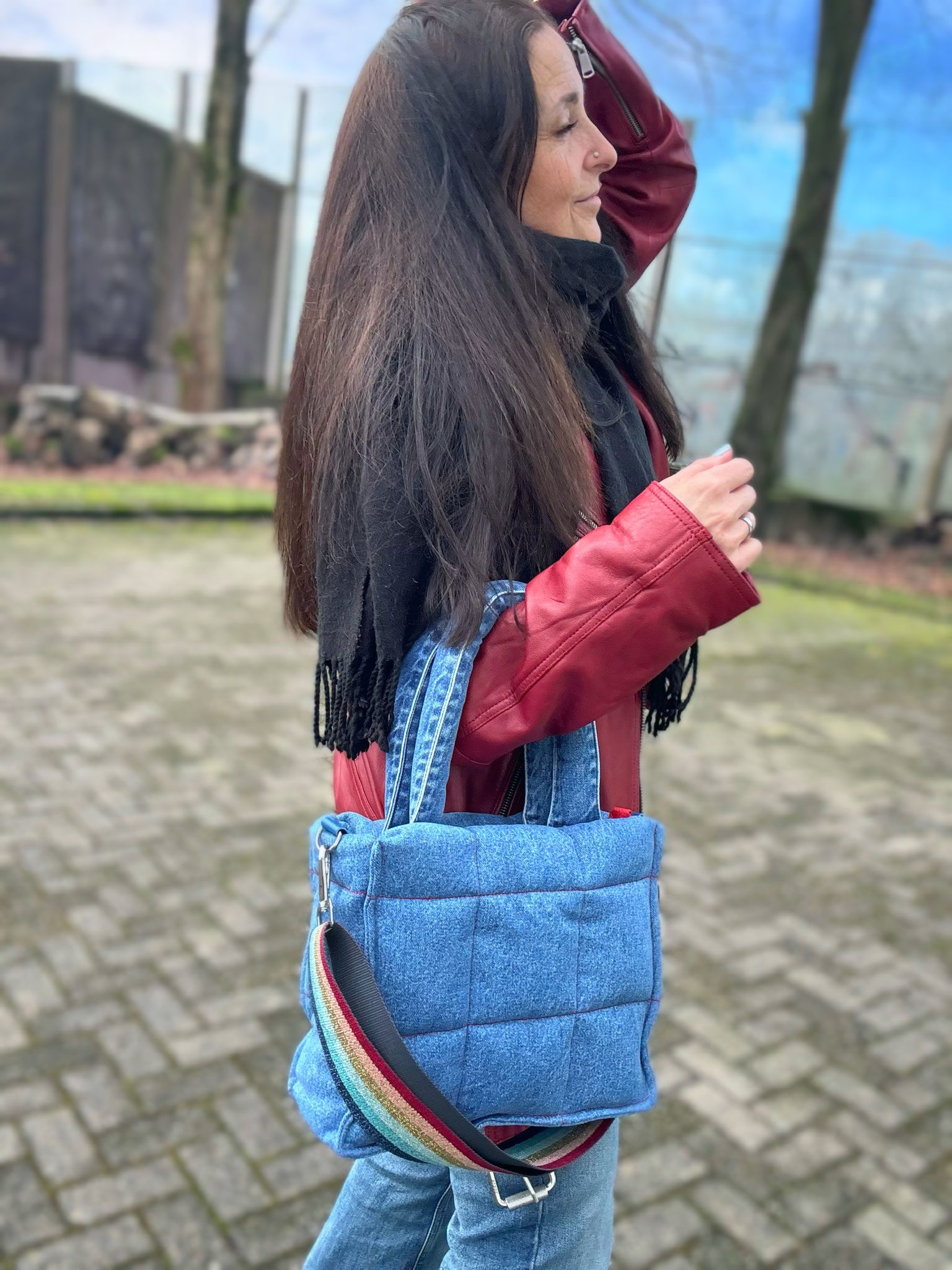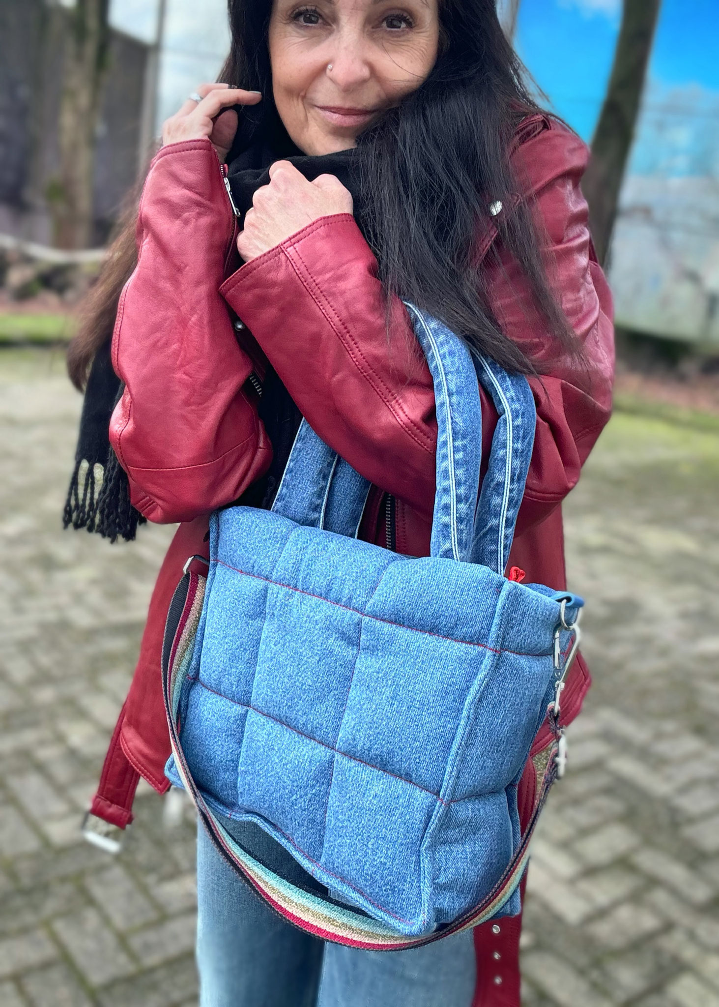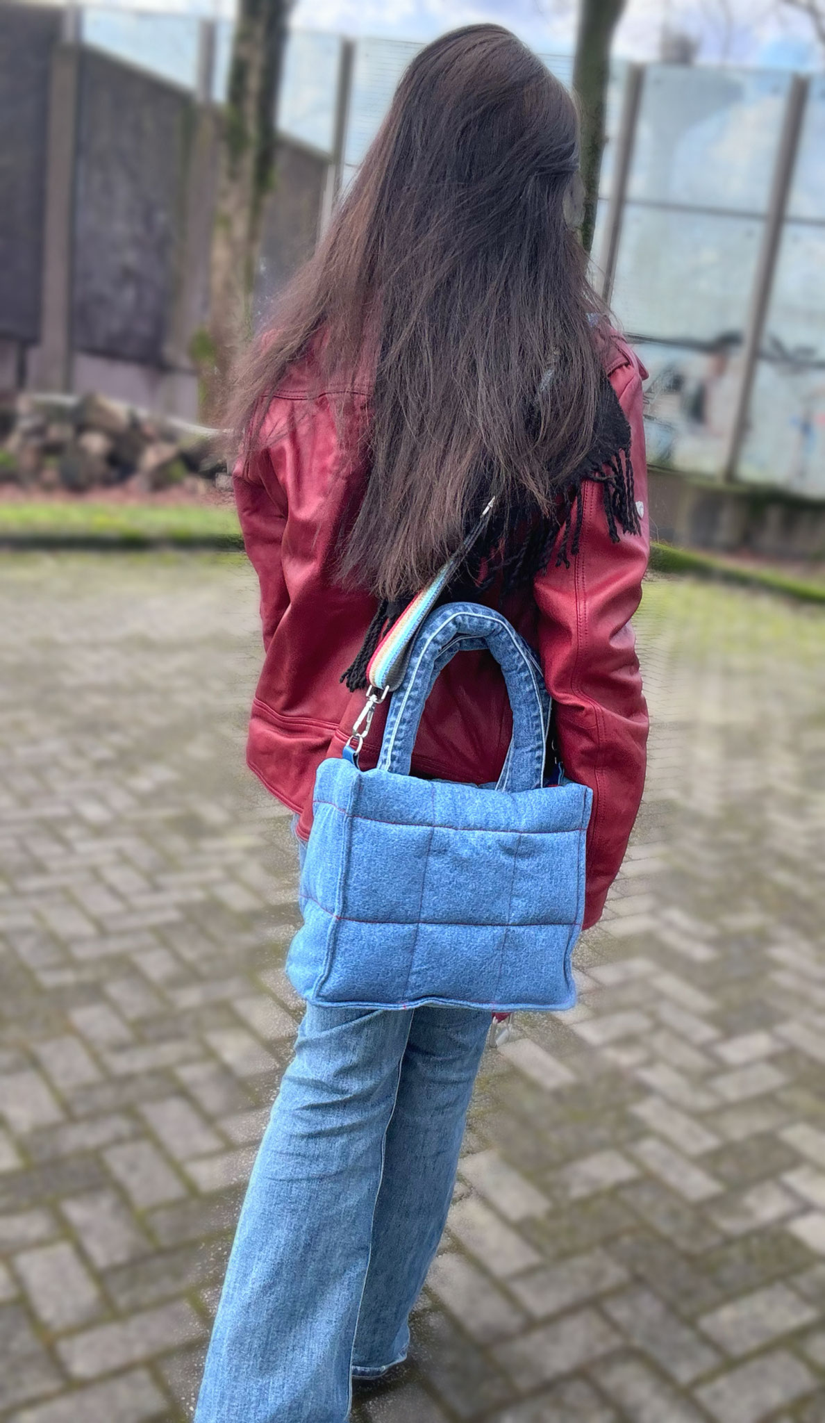 entstand aus einer Jeansjacke und einem Comic Stoff und wurde mit roten Lederstücken im Innenbereich veredelt.