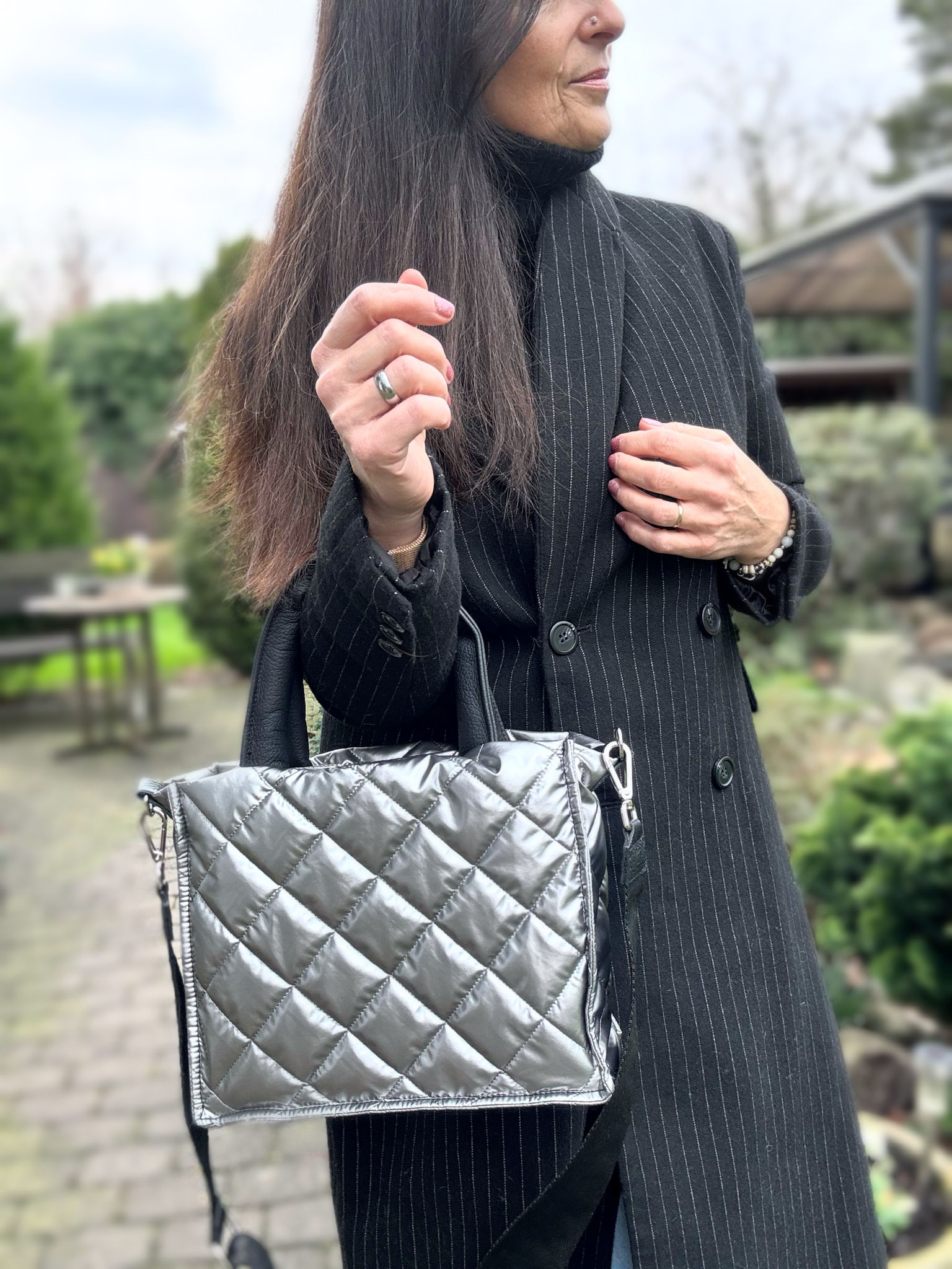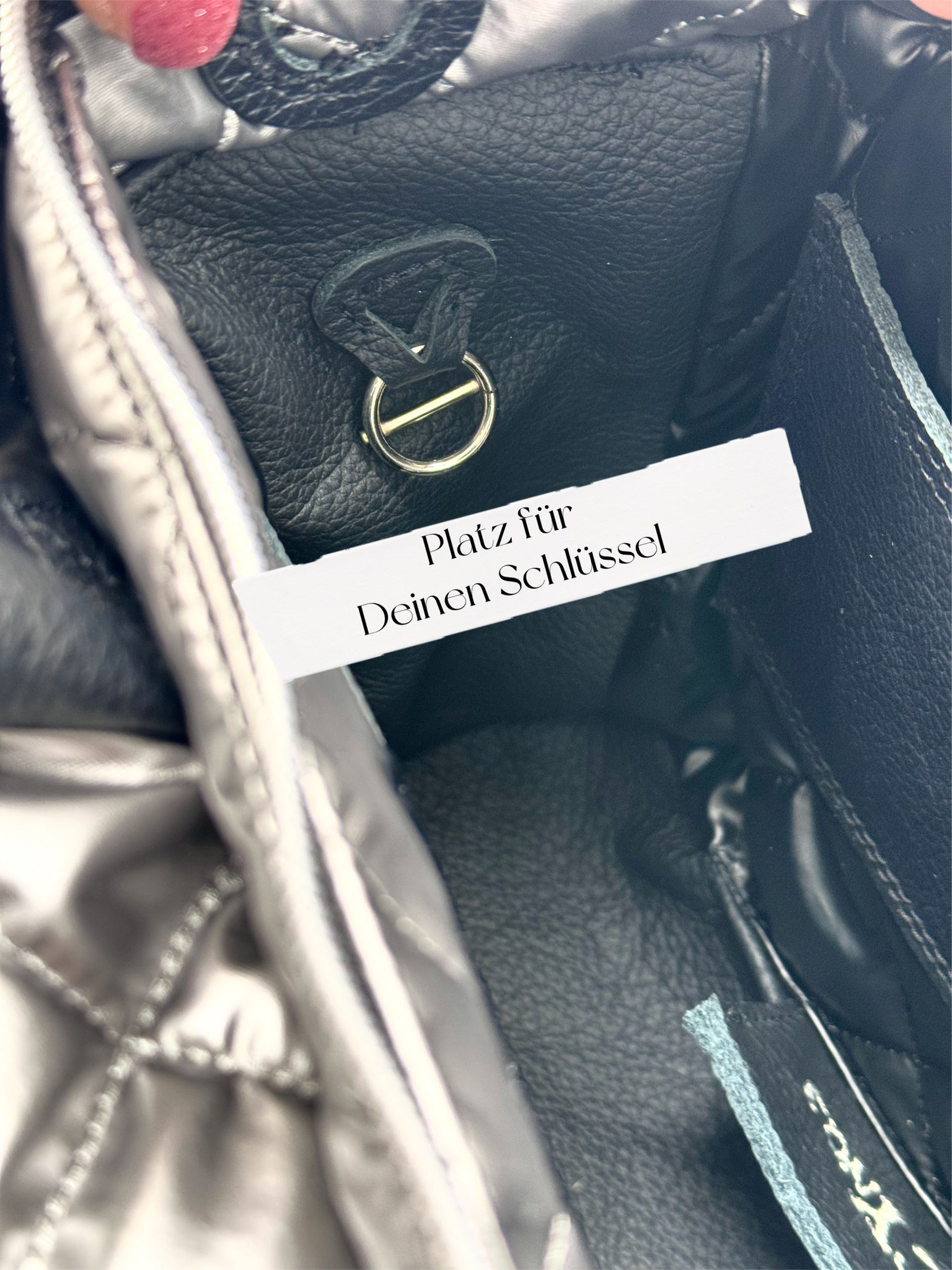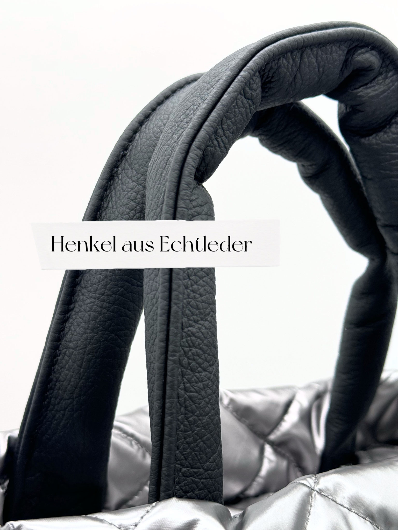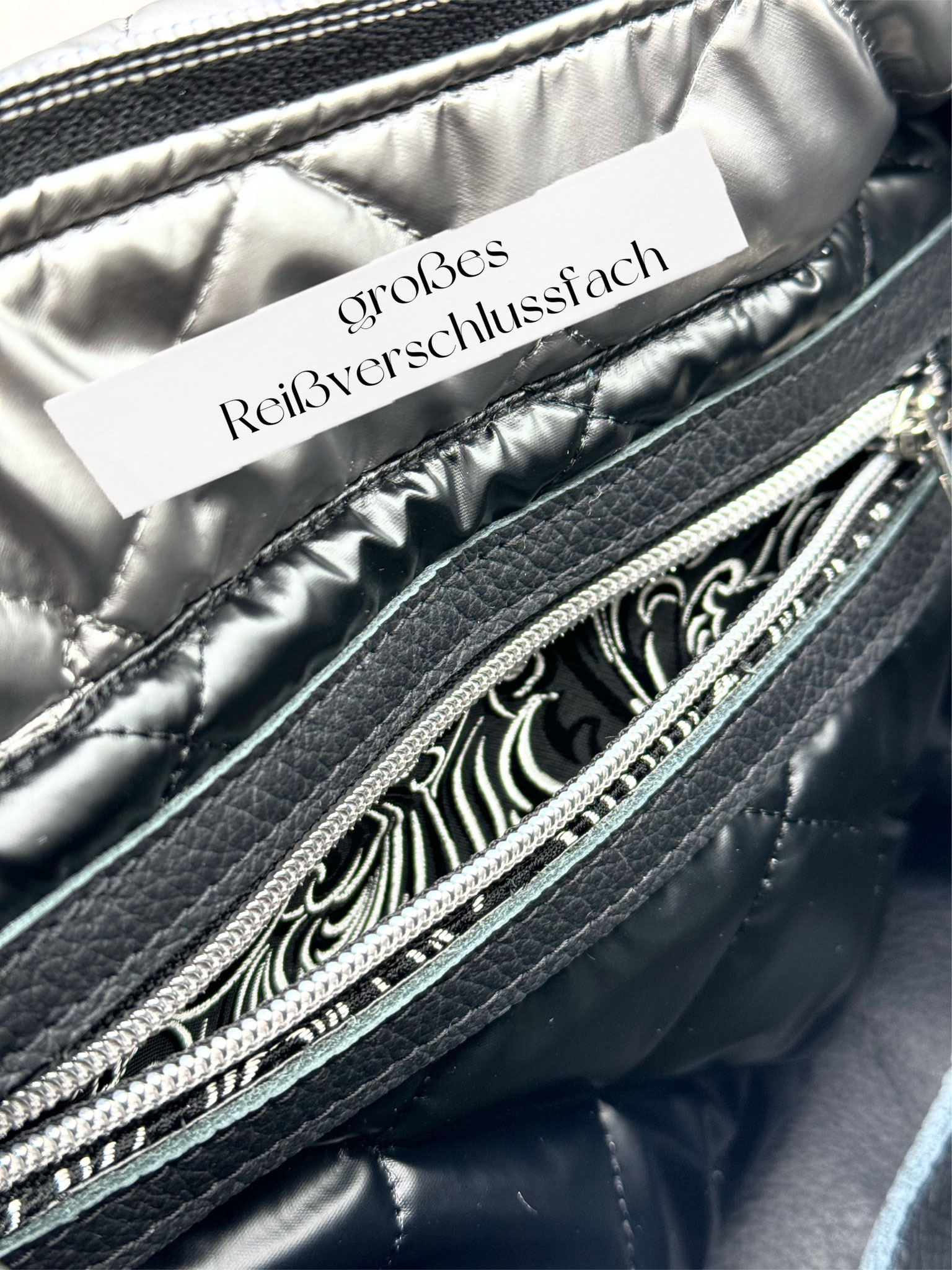 entstand aus LEDERRESTEN und aus STEPPSTOFFEN (silber & schwarz)