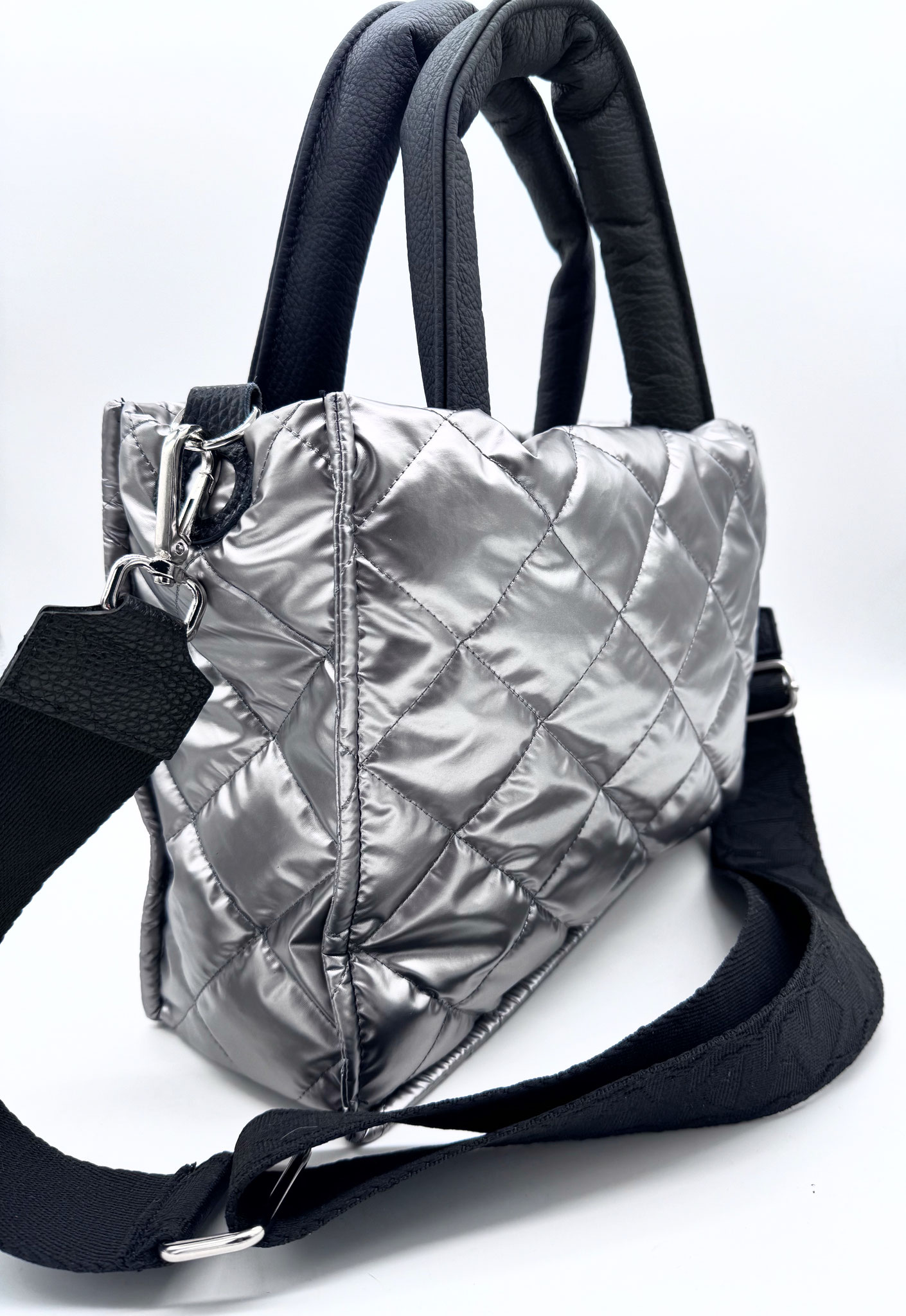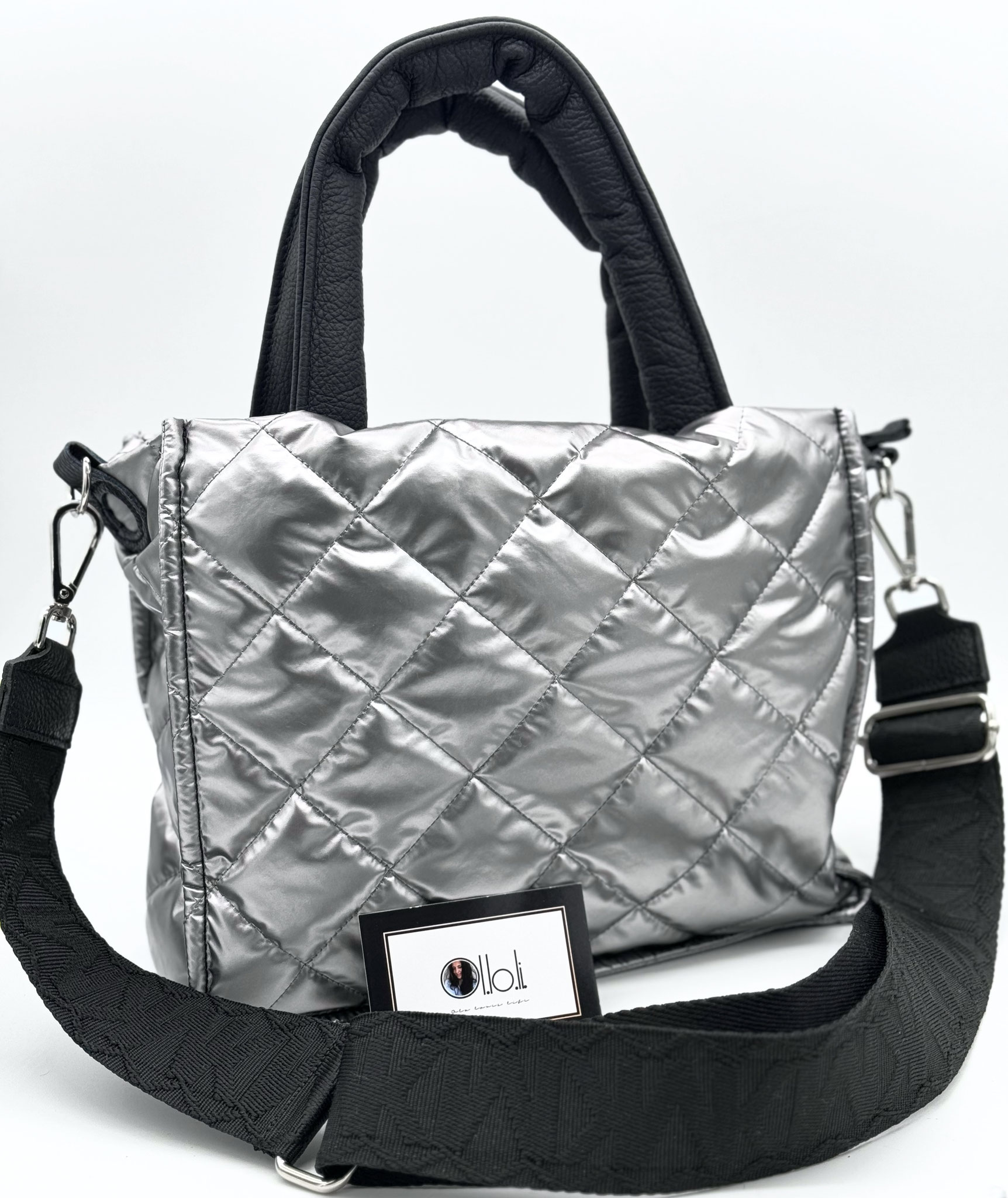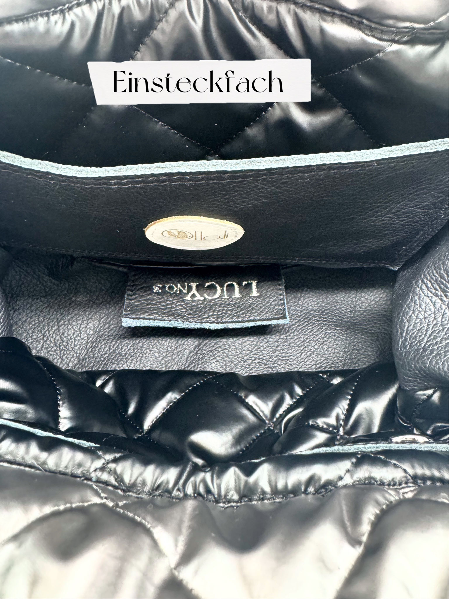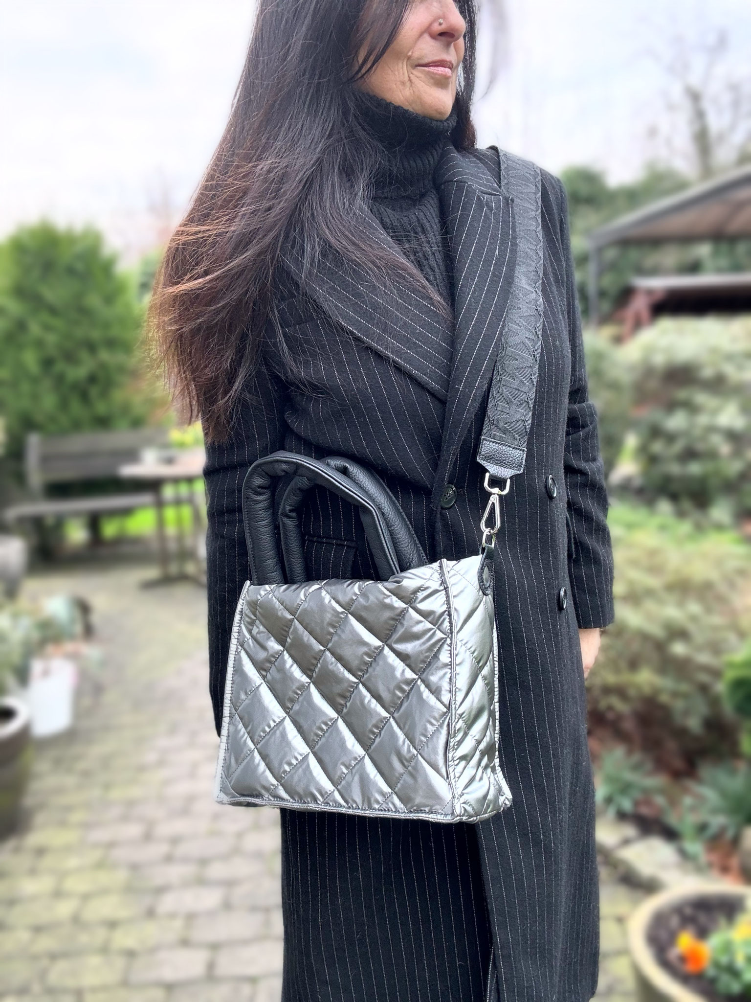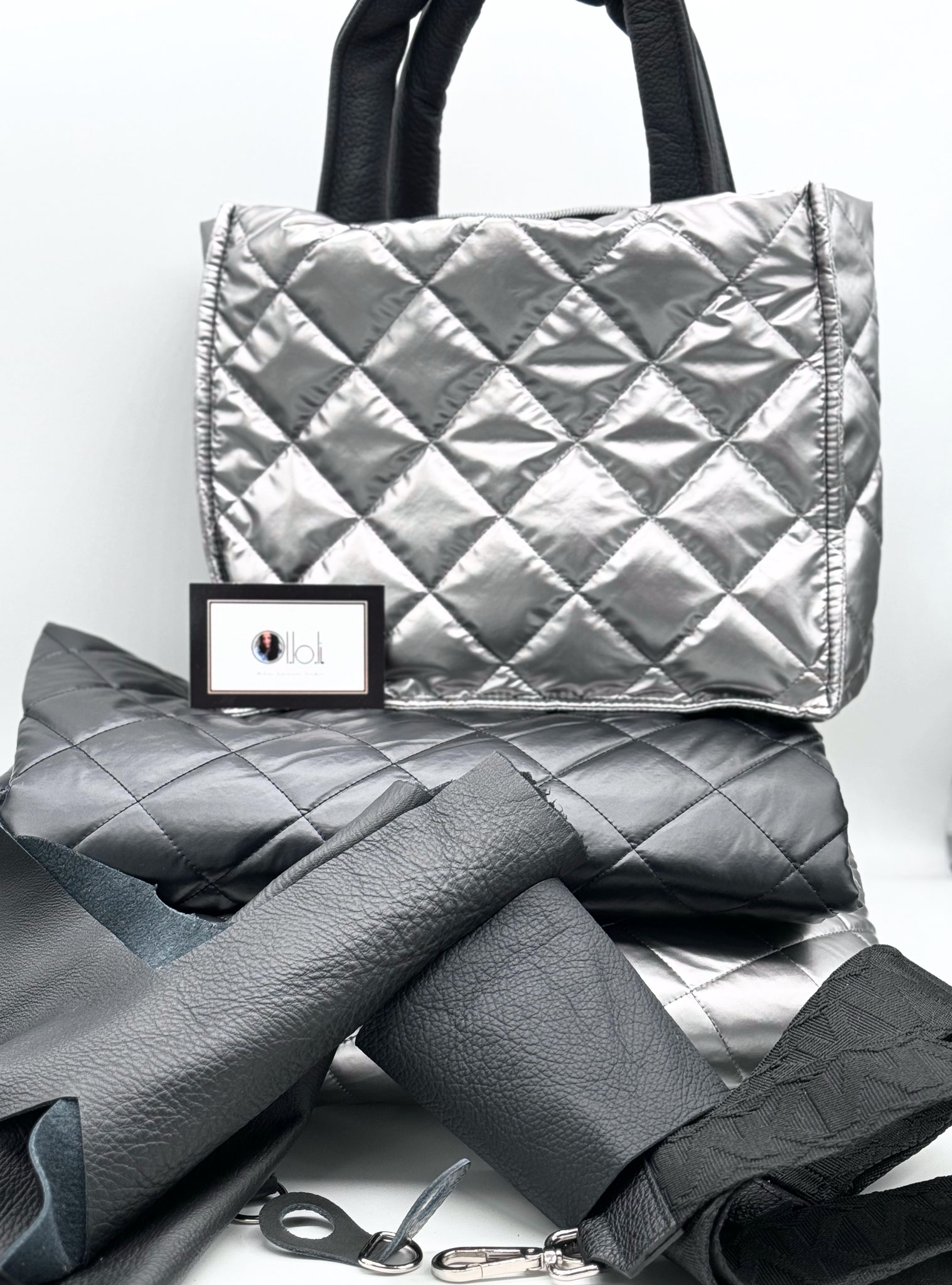 entstand aus LEDERRESTEN und aus STEPPSTOFFEN (silber & schwarz)