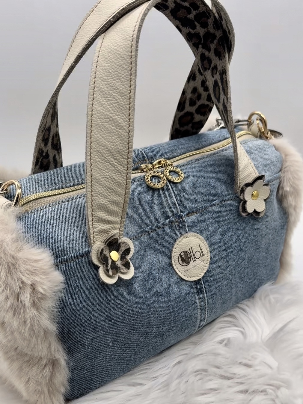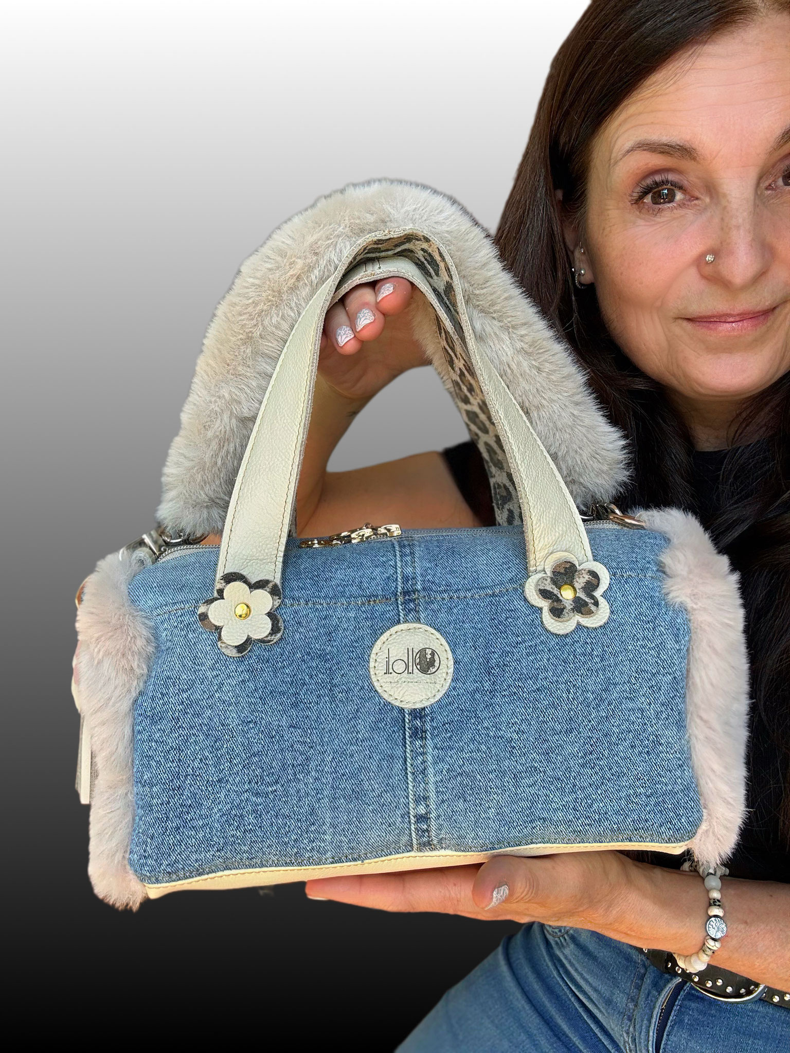entstand aus einer Jeanshose und Kunstfell, mit Henkeln aus Echtlederresten .